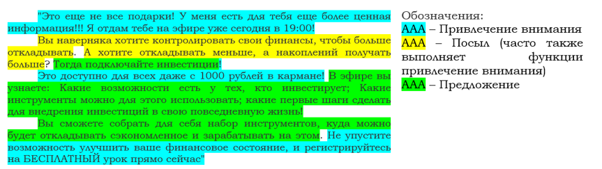 Таким образом, создание подобного рекламного текста по сути является трудом механическим. Лицо осознанно следует алгоритму (либо подсознательно копирует множество рекламных записей, которые видело до этого), адаптируя при этом (но не внося творческие коррективы) общий алгоритм для конкретной задачи23.